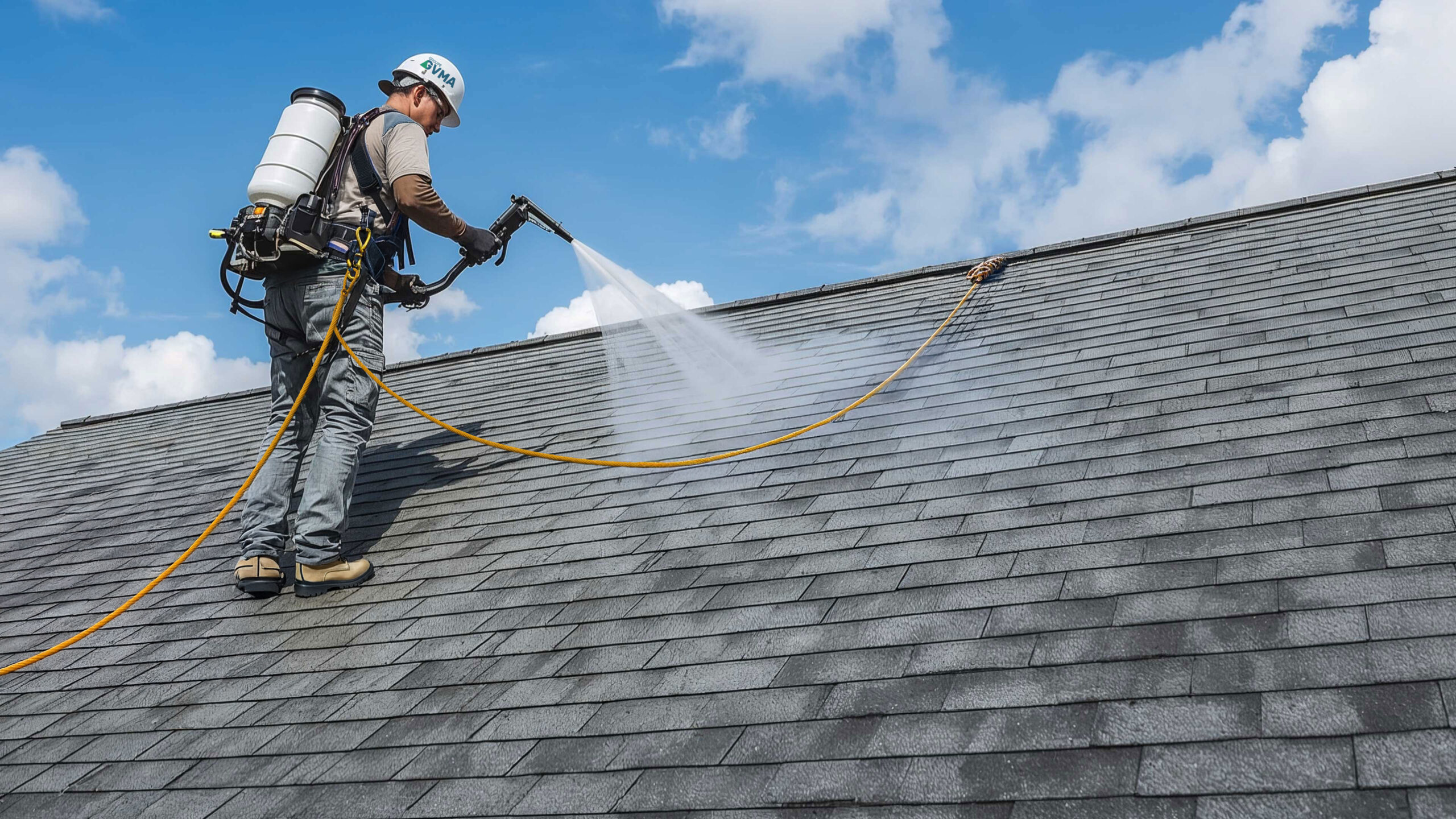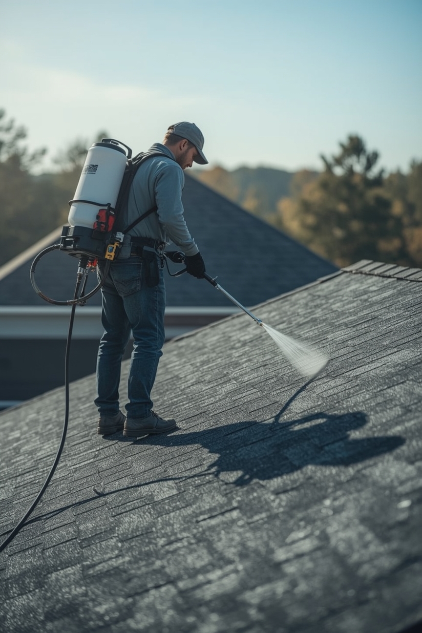 L’application du scellant est ensuite effectuée à l’aide d’un système de pulvérisation de grade commercial de haute précision. Le produit est vaporisé uniformément sur l’ensemble des bardeaux, assurant une couverture homogène. Le procédé ne requiert aucun démontage, n’altère pas la structure existante et n’endommage pas la toiture.